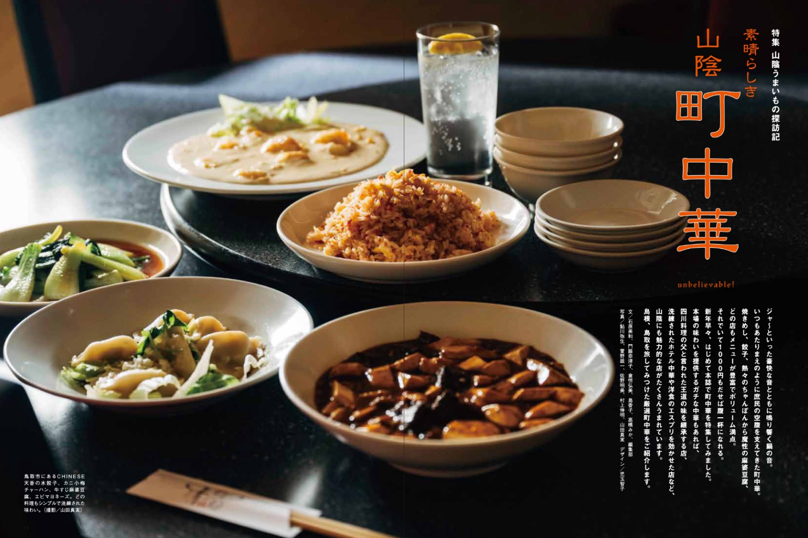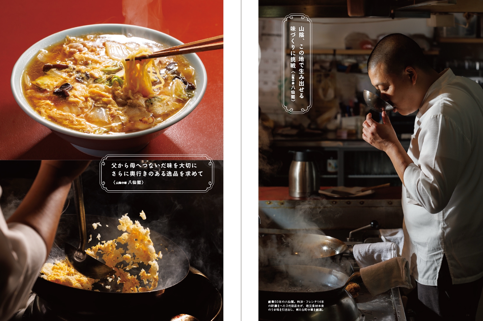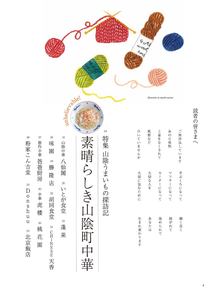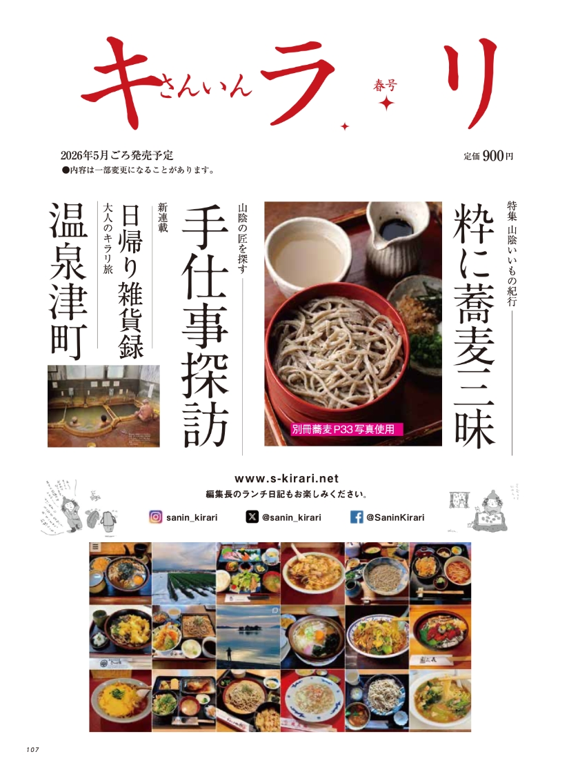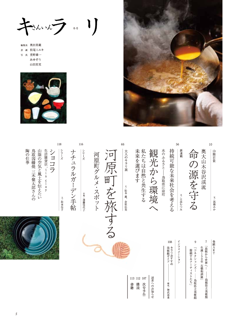 ● 特集:山陰いいもの紀行「素晴らしき山陰町中華」。 はじめて本誌で町中華を特集してみました。本場の味わいを提供するガチな中華もあれば、四川料理の父と言われた王道の味を継承する店、洗練されたホテル中華や洋食のエスプリを効かせた店など、山陰にも魅力的な店がたくさんうまれています。島根、鳥取を旅してみつけた厳選町中華を紹介します。 ● 大人のキラリ旅:鳥取市河原町を旅する。 江戸時代後期、よい土を求めて石見国からやってきた陶工が始めた牛ノ戸焼窯、新作民芸で知られる因州・中井窯、人間国宝の前田昭博氏のやなせ窯——そこに木工やガラス工芸などの作家も加わって、「工芸の郷」が作られていると聞く。 ● 新連載:持続可能な未来を考える「水のふるさと—鳥取県江府町『観光から環境へ』」。 全国でも良質な天然水が育まれる江府町で始まった「奥大山自然塾」「水を軸にしたプラネタリーヘルスの実践」など、自然と共生する取り組みを紹介します。