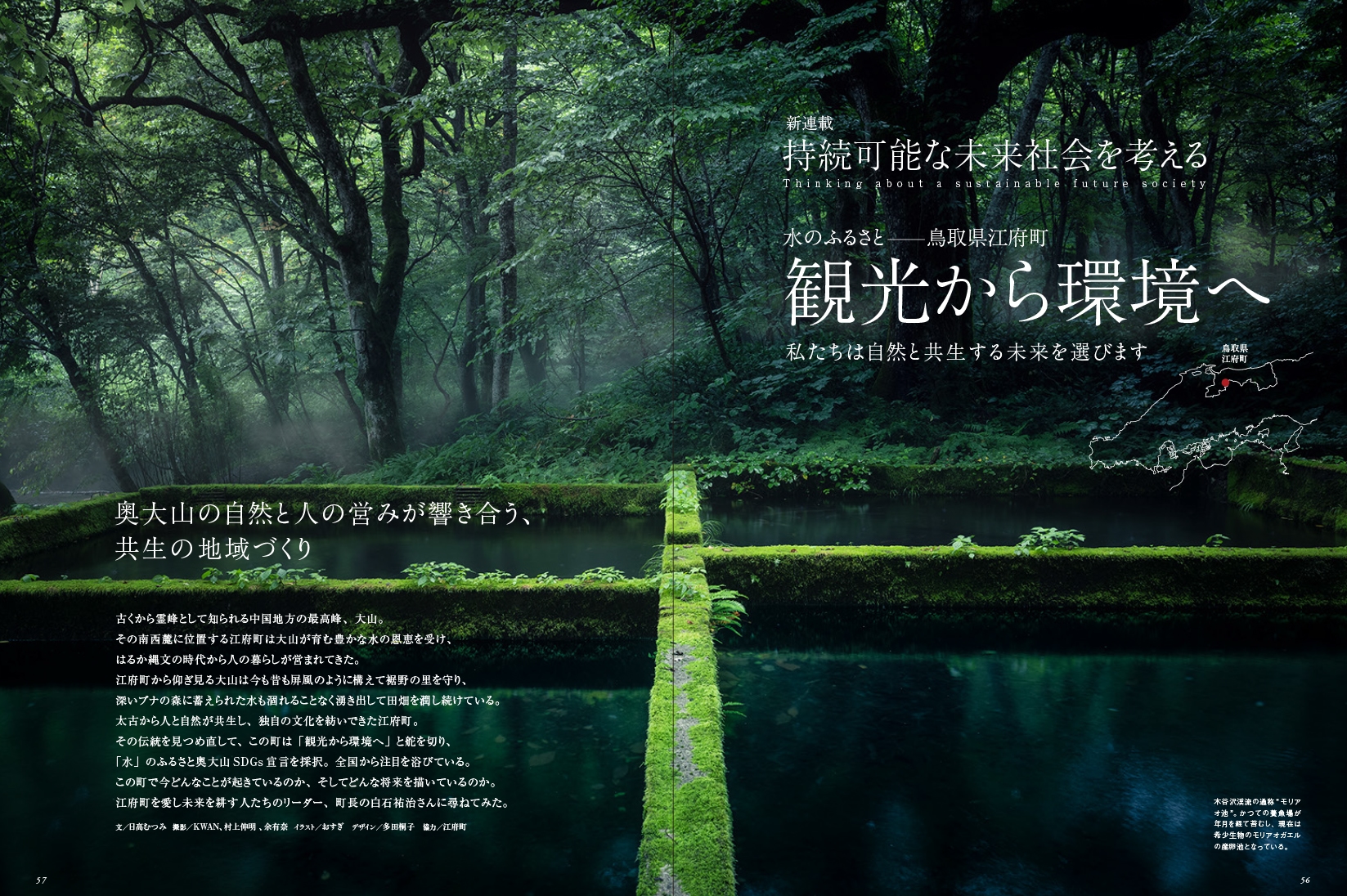 ● 特集:山陰いいもの紀行「水辺で和む夏秋グルメ」。島根・鳥取・兵庫・京都と東西に長い山陰海岸、緑と海に囲まれた京丹後から島根県益田市まで足を延ばして美しい水辺で美味しいと評判の飲食店を選びました。● 大人のキラリ旅:大森町を旅する。人間らしい暮らし方・生き方を求めて移住する若い世代がこの10年間で徐々に増えている島根県大田市大森町。人口400人ほどの町は今ベビーラッシュに沸いて、存続を危ぶまれた保育園は施設を増築、小学校の児童も増加しているという。世界遺産登録前の2005年に大森町を特集した本誌。それから20年、どんなふうに変貌したのだろうか。● 第2特集:経済学者・宇沢弘文「自然と人の共生社会と教育」。日本人でノーベル経済学賞にもっとも近いといわれた鳥取県米子市出身の故宇沢弘文。一昨年発行の本誌54号で特集した際、多くの反響がありました。その特集第二弾。